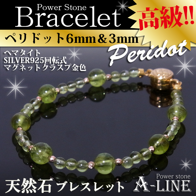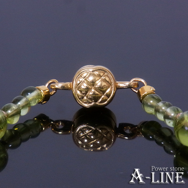 ペリドット6mm、ペリドット3mm、ヘマタイト・ファセット(コーティング)金色、SILVER925製マグネットクラスプ金色、形状記憶超弾性ワイヤー、ワンプッシュ