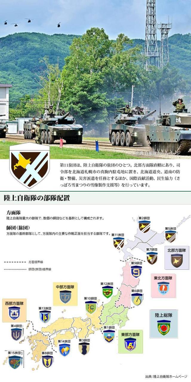 第11旅団の部隊章は、担任区域である北海道の地図とローマ数字で師団番号の「11」をあしらい、意匠化されています。