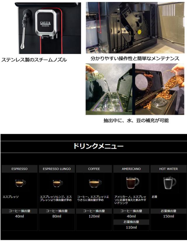 | SUP051W GAGGIA ガジア 全自動コーヒーマシン MAGENTA PLUS マジェンタ プラス スペック情報 | |