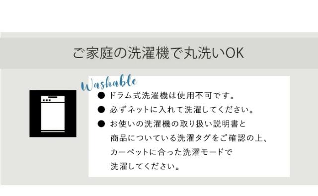 | 洗濯について | ・タテ型家庭用洗濯機で丸洗いができます(ドラム式不可)。 ・必ず洗濯ネットに入れて洗濯してください。 ・商品についている洗濯タグと、洗濯機の取り扱い説明書をご確認の上、 カーペットに適した洗濯コースで洗濯してください。 |