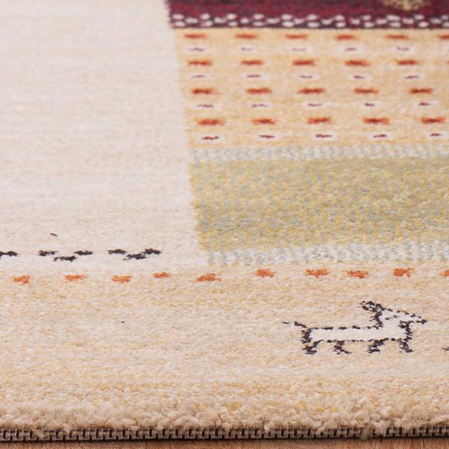 まるでギャッベのような民族テイストのラグです。可愛らしいモチーフを、優しい色合いで織り上げた温かみのあるデザインです。