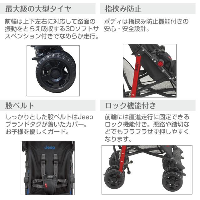 【特徴】一番小さなJEEPベビーカー!足回りがタフなJeep車のように、タフな走行を目指してクラス最大級のタイヤを装備。ゼンリンは上下左右に対応して路面をとらえる、3Dソフトサスペンション付き。路面の振動を吸収して、滑らかな走行を実現。ボディは指挟み防止機能付きの安心・安全設計。前輪キャスターは回転をロック出来る機能付き。
