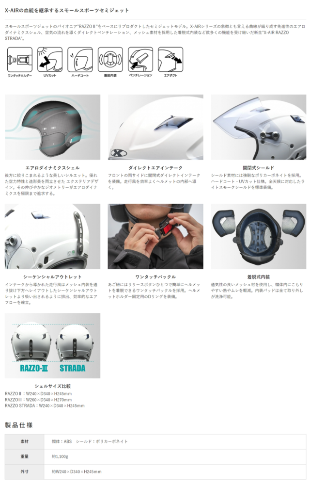 スモールスポーツジェットのパイオニア"RAZZO 2"をベースにリプロダクトしたセミジェットモデル。X-AIRシリーズの象徴とも言える曲線が織り成す先進性のエアロダイナミクスシェル、空気の流れを導くダイレクトベンチレーション、メッシュ素材を採用した着脱式内装など数多くの機能を受け継いだ新生"X-AIR RAZZO STRADA"