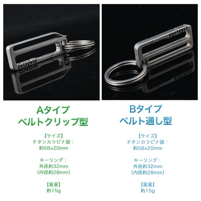 【タイプ】Aタイプ:ベルトクリップ型【サイズ】チタンカラビナ部:約58×20mm キーリング:外径約32mm(内径約28mm) 、Bタイプ:ベルト通し型【サイズ】チタンカラビナ部:約58×20mm キーリング:外径約32mm(内径約28mm)【重量】約15g