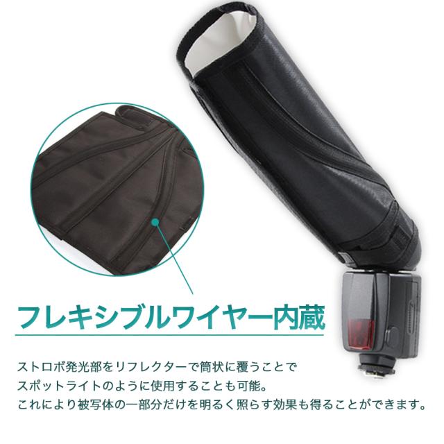 フレキシブルワイヤー内蔵のため、ストロボ発光部をリフレクターで筒状に覆うことでスポットライトのように使用することも可能。