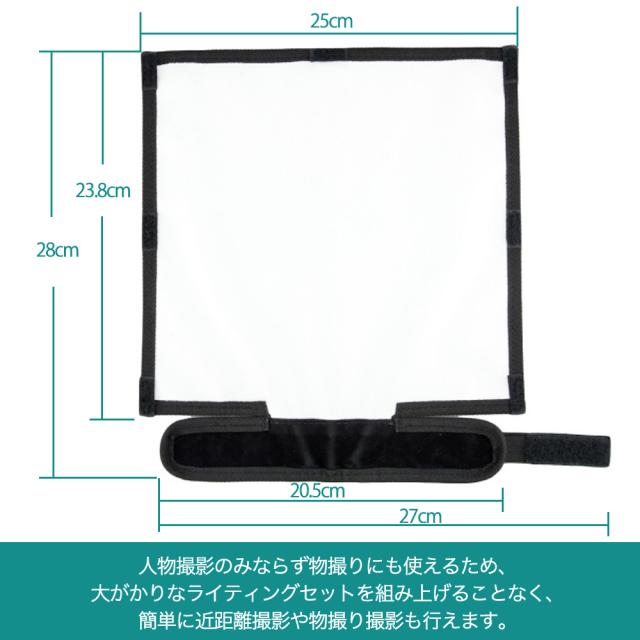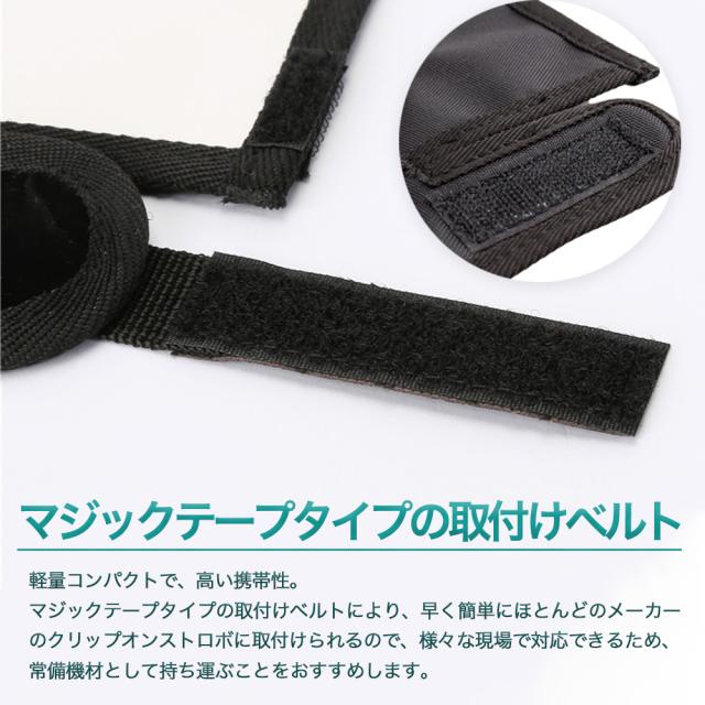 軽量コンパクトで携帯性が良く、マジックテープタイプの取付けベルトにより、早く簡単にほとんどのメーカーのクリップオンストロボに取付けられるので、様々な現場で対応できるため、常備機材として持ち運ぶことをおすすめします。