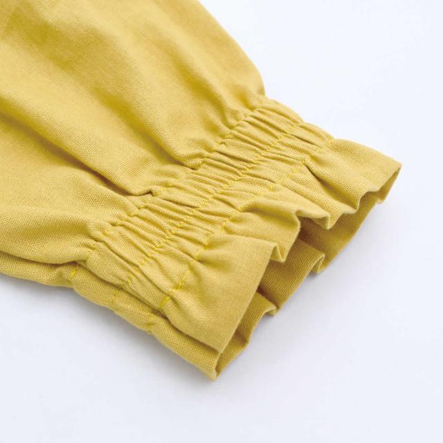 袖口はギャザーの入ったフリルで女性らしく、お洒落な印象を与えてくれます。また、吸水性・耐久性に優れた天然素材で、心地よいさらっとした肌触りです。