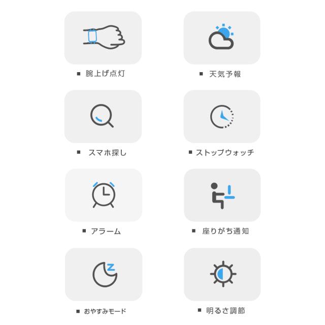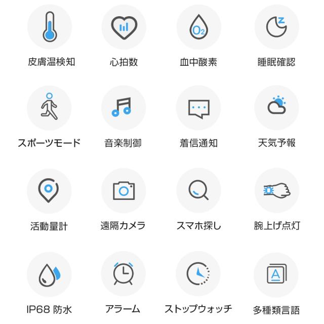 本体機能:皮膚温変動検知/心拍/着信通知/血中酸素/睡眠/歩数/カロリー消費/走行距離/天気予報など