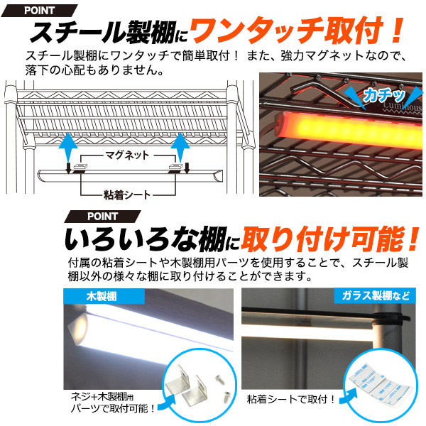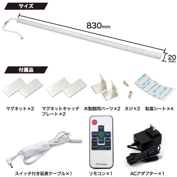 付属品:ACアダプター/スイッチ付き延長ケーブル/マグネットキャッチプレート×2/マグネット×2/木製棚用パーツ×2/ネジ×2/粘着シート×4/リモコン
