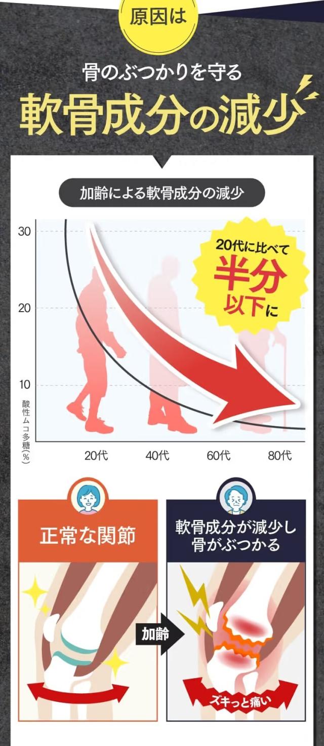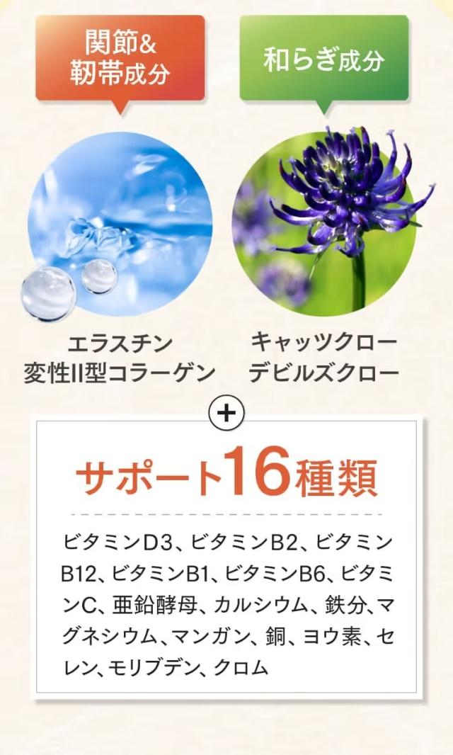 ブラックジンジャー抽出物(ブラックジンジャーエキス、デキストリン)(国内製造)、還元麦芽糖水飴、酵母(亜鉛含有)、難消化性デキストリン、プロテオグリカン含有サケ鼻軟骨抽出物(デキストリン、サケ鼻軟骨抽出物)、澱粉、エラスチン、キャッツクローエキス末、デビルズクローエキス末、海藻末、ミネラルイースト、鶏軟骨抽出物(非変性?型コラーゲン含有)/セルロース、ビタミンC、ビタミンB1、ビタミンB2、ステアリン酸カルシウム、ビタミンB6、微粒酸化ケイ素、ピロリン酸第二鉄、ビタミンB12、ビタミンD3