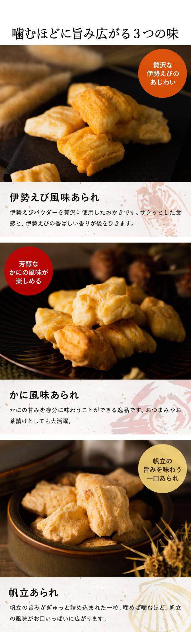 ●原材料:水稲もち米(国産)、植物油脂、粉末調味料(食塩、ほたてエキス、粉末しょうゆ、昆布エキス、配合調味料)、カニエキス調味料、イセエビシーズニング、ホタテエキスパウダー、粉末調味料(たん白加水分解物、食塩、粉末しょうゆ、デキストリン、香辛料、植物油)、伊勢海老パウダー/調味料(アミノ酸等)、香料、加工デンプン、香辛料抽出物、甘味料(ステビア)、酸味料、(一部に小麦・かに・えび・大豆・豚肉・鶏肉・ごま・ゼラチンを含む)