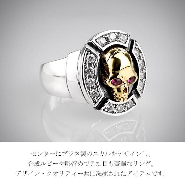 センターにブラス製のスカルをデザインし、目には合成ルビーをセッティング。