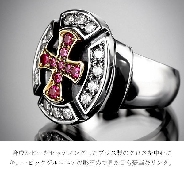 合成ルビーをセッティングしたブラス製のクロスをリング中心にデザイン。
