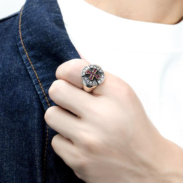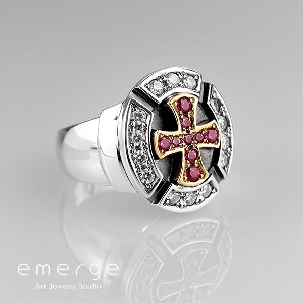 クロスを取り巻くキュービックジルコニアの彫留めで見た目も豪華なリング。