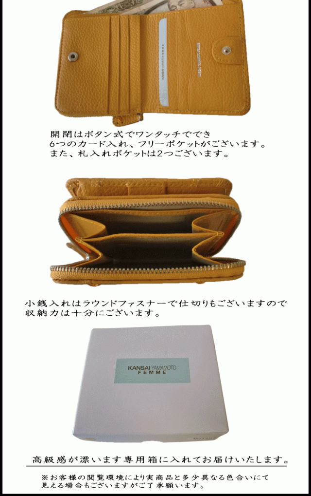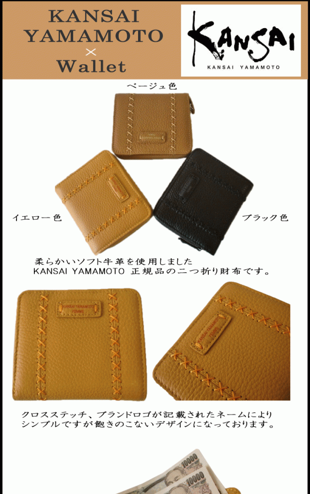 | 備考 | 人気ブランド:KANSAI YAMAMOTO の二つ折り財布です。 素材:牛革 カード用ポケット数:6 小銭入れ:ラウンドファスナー式 |