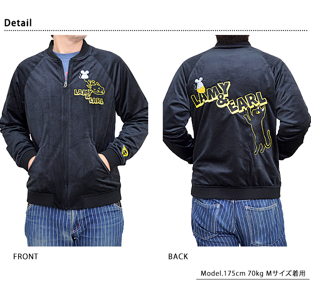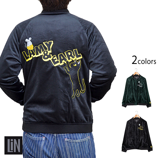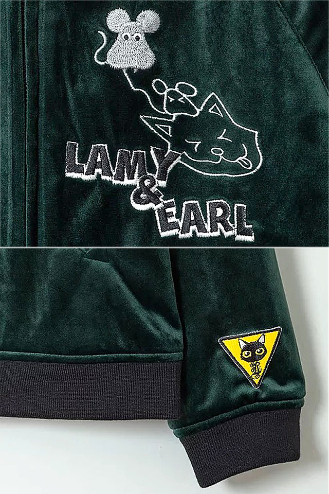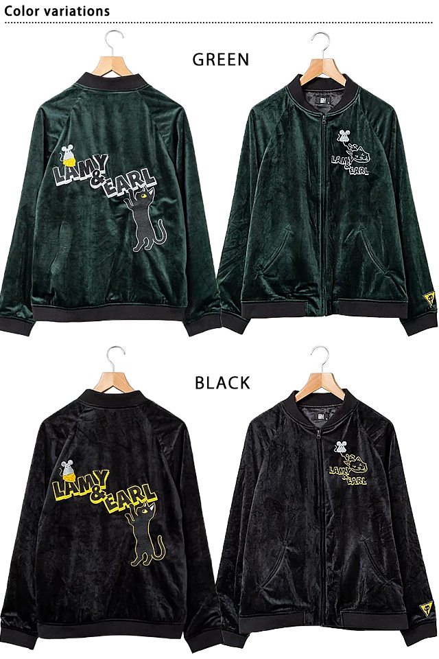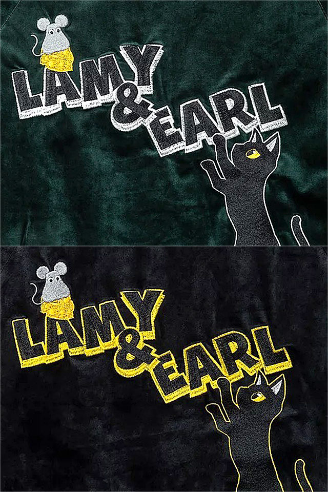 何でもあり、何でもやる新ブランド「LIN」から「ラミ&アールベロアジャケット(AL-75060)」のご紹介です。 黒猫のLamy(ラミ)とネズミのEarl(アール)。 チーズを分けて欲しいラミが頑張ってアールのところに行こうとしている、二匹の日常を切り抜いたデザイン。 フロントには、ラミがたどり着くまでの間に拾ったチョークでラミとアールを描くアールの姿を描きました。 フロントはジップアップ仕様。 ボディーにはてろんとしたベロア生地を採用。 | ||||||||||||||||||||