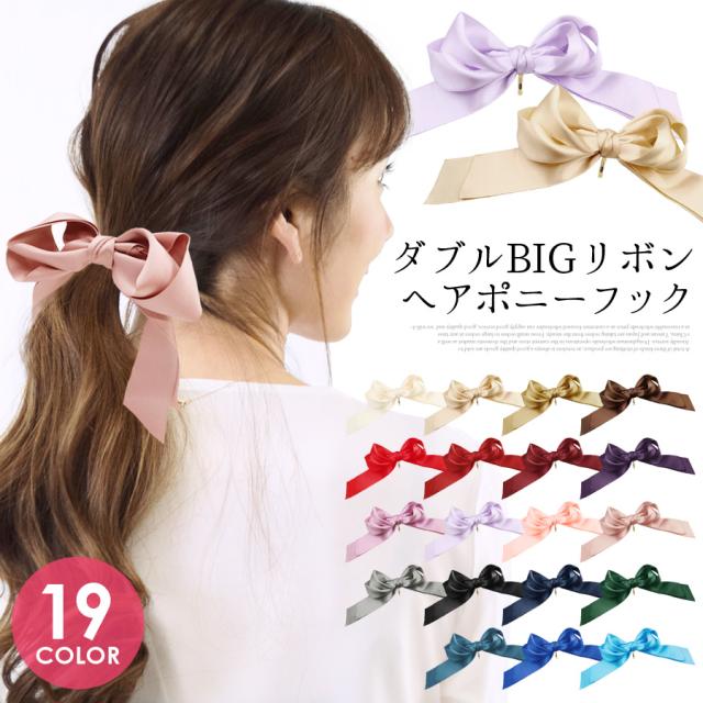 ヘアカフス ポニーフック BIG リボン レイヤード ヘアポニー フック レディース ヘアアクセサリー ハーフアップ ヘアアクセ まとめ髪 ヘアピアス ダブル サテン 大きめ 大人 上品 結婚式 オケージョン 韓国 送料無料 (hak733)