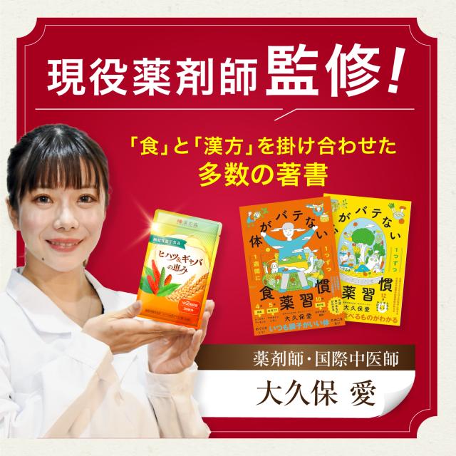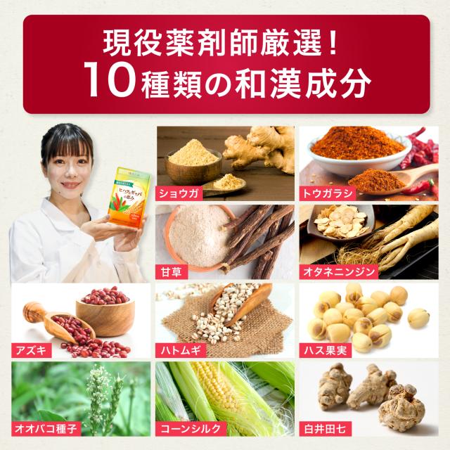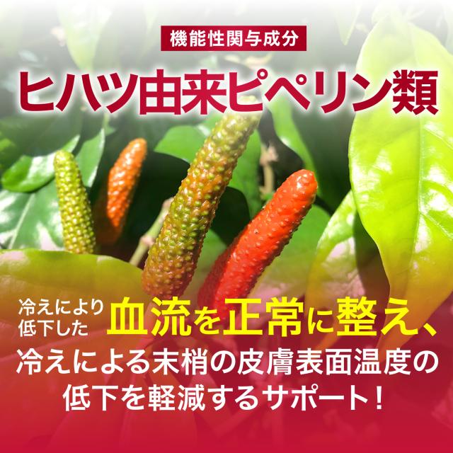 原材料:ヒハツエキス末(デキストリン、ヒハツエキス)(国内製造)、大麦乳酸発酵液ギャバ、還元麦芽糖水飴、デンプン、コーンシルクエキス末、植物抽出エキス末、ショウガ末、有機田七人参粉末、唐辛子末、結晶セルロース、ステアリン酸カルシウム、HPC、微粒二酸化ケイ素、塩化カリウム、セラック、カルナウバロウ