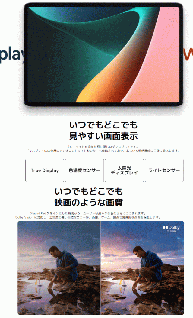 Xiaomi Pad 5をオンにした瞬間から、ユーザーは鮮やかな色の世界につつまれます。Dolby Visionに対応し、忠実度の高い自然なカラーが、画像、ゲーム、映画で驚異的な画質を保証します。