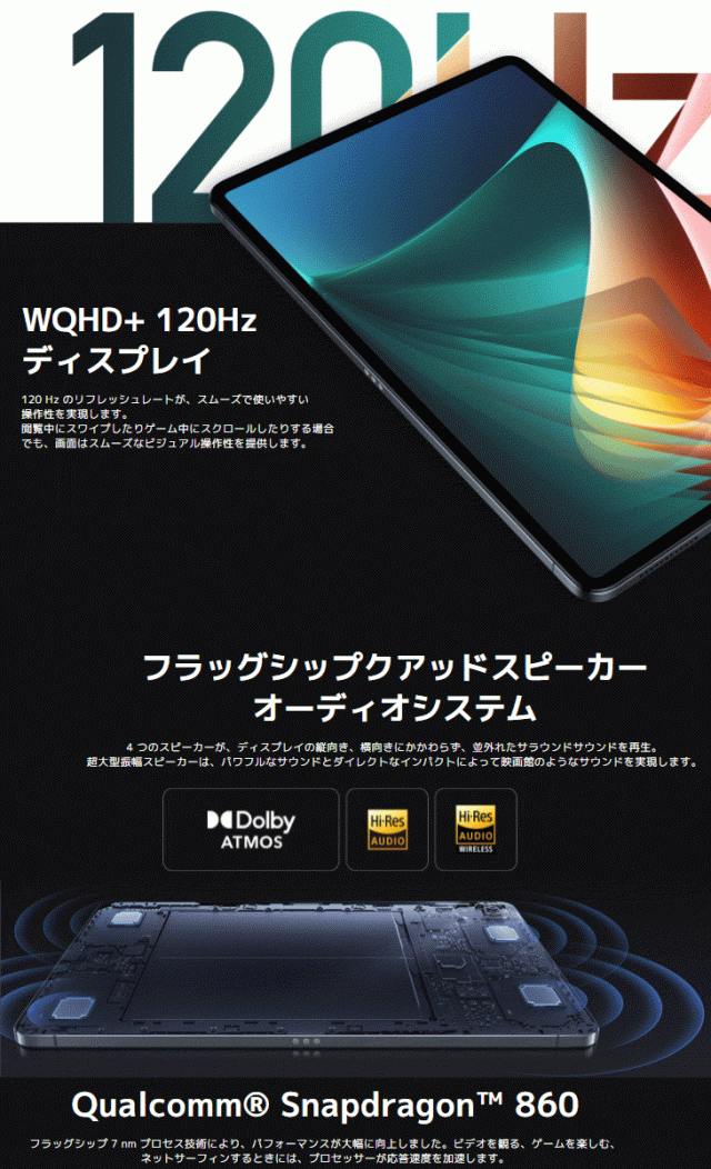 | ディスプレイ | サイズ:11インチ IPS LCD ディスプレイ解像度:1600×2560(WQHD+) ・275 ppi ・リフレッシュレート:120 Hz ・輝度:500 nits(typ) ・10 億色以上 ・DCI-P3 をサポート |