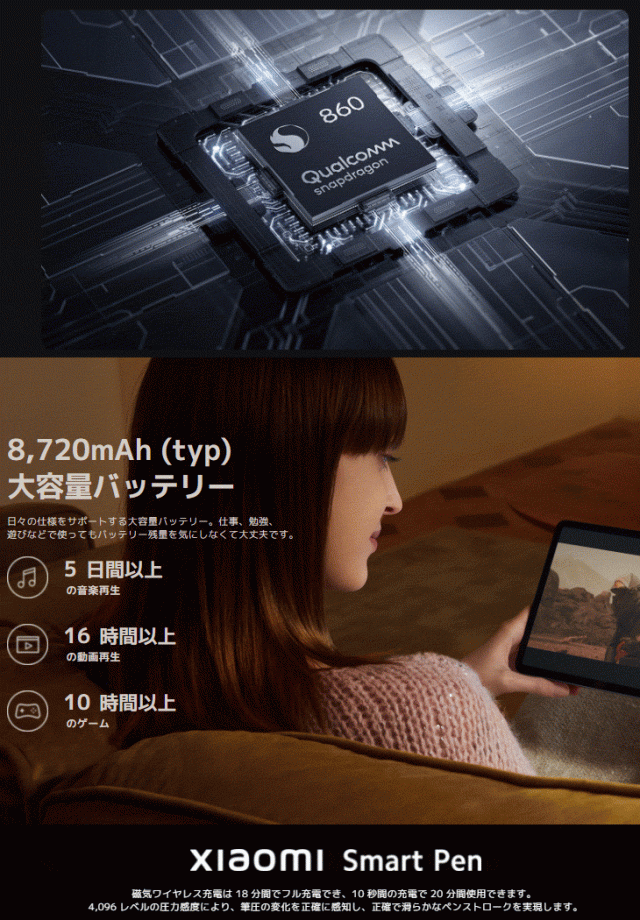 搭載された Qualcomm Snapdragon 860と120Hzの高リフレッシュレート画面により、とてもスムーズな操作が可能です。大容量8720mAh(typ)バッテリーによって、充電に関連するあらゆる心配が解消されます。
