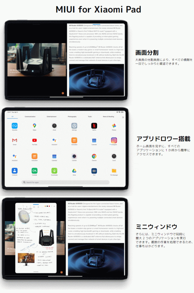 魅力的なハードウェアに加え、より便利で、使いやすいMIUI for Padを搭載しました。このソフトウェアにより、Xiaomi Pad5は効率的に仕事をすることをサポートします。