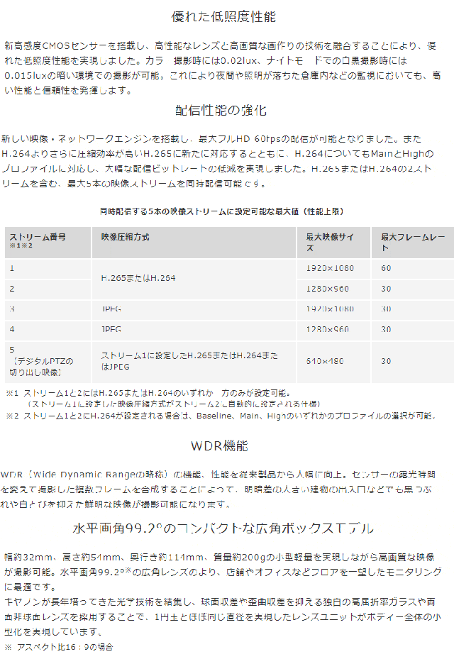 | ネットワークカメラ 小型ボックスモデル VB-S920F スペック情報 | |