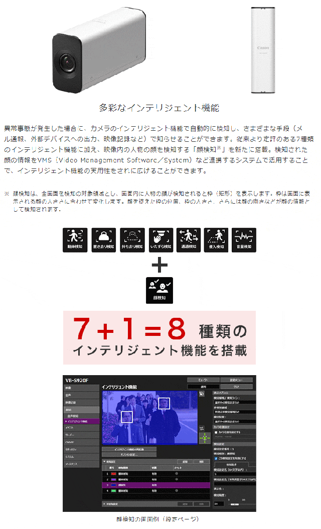 | インテリジェント機能 | 動体検知、置き去り検知、持ち去り検知、いたずら検知、通過検知、侵入検知、音量検知、顔検知 |