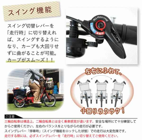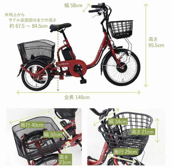 従来のサイズより一回り小さくする事で両足が地面に着き小柄な方やシニア世代の方にも無理なく安心してご乗車頂けます。さらにアシスト機能がお出かけや買い物の心強い味方に!■メーカー:ミムゴ■型番BEPN18■商品サイズ[フロント]18インチ[リア]14インチ/組立時約W140×D58×H95.5cm■サドル地上高さ約67.5〜84.5cm■適応身長約130cm〜■商品重量約27.5kg■カラー:ブリックレッド■仕様:アシスト機能・シングルギア・スイング機能・ワンタッチコントローラー・パーキングロック・前カゴ(樹脂製)・後カゴ(メッシュ)・LEDライト・前輪錠(スペアキー付)・耐摩耗タイヤ■アシスト切替3モード(低・中・高)【代引&同梱&配達日時指定不可・北海道&沖縄&離島(中継)地域送付不可】※到着は地域によって異なり大型商品の為、7〜10営業日程掛かります。出荷後の転送・キャンセルができません。三輪自転車は構造上、二輪自転車とは全く乗車感覚が違います。安全な場所で十分練習してからご使用下さい。左右のバランスをとりながらの走行が必要です。
