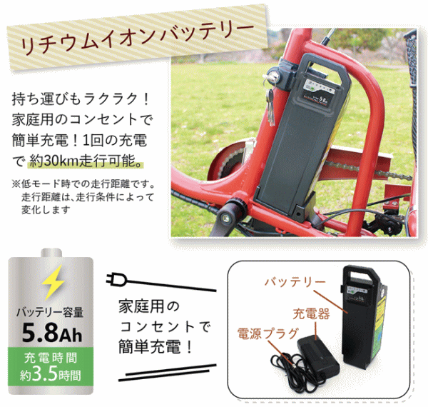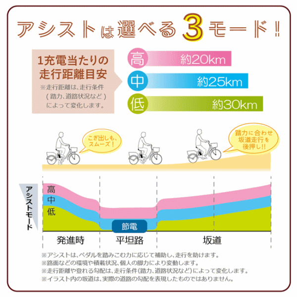 | 走行距離(目安) | 約30km(充電1回分/低モード時)※走行距離は走行条件によって変化します |