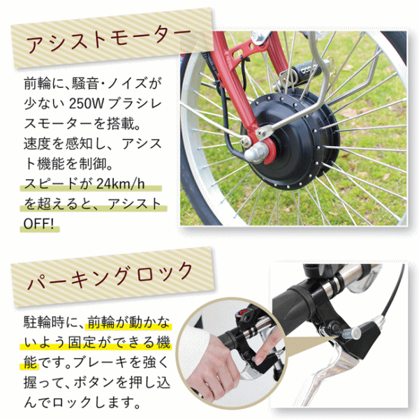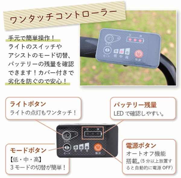 | 仕様 | アシスト機能・シングルギア・スイング機能・ワンタッチコントローラー・ パーキングロック・前カゴ(樹脂製)・後カゴ(メッシュ)・LEDライト・ 前輪錠(スペアキー付)・耐摩耗タイヤ |