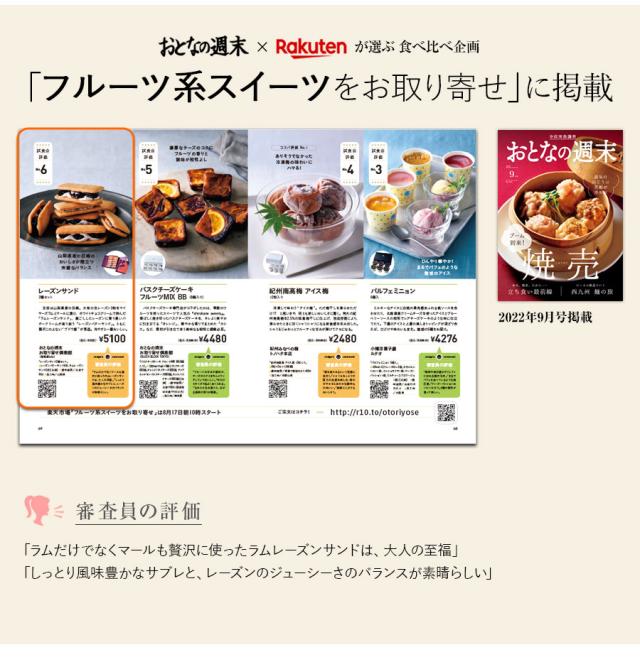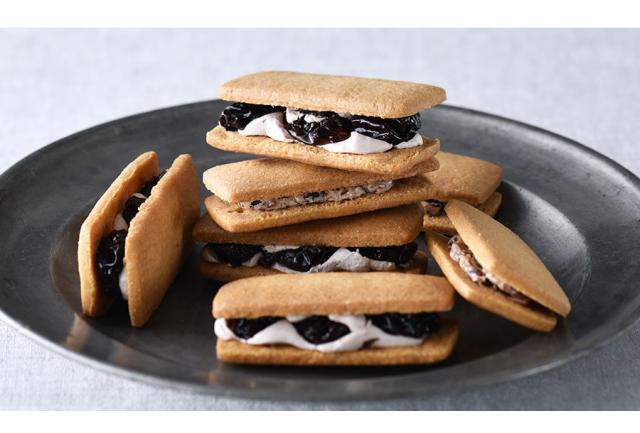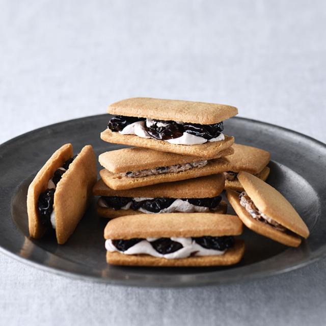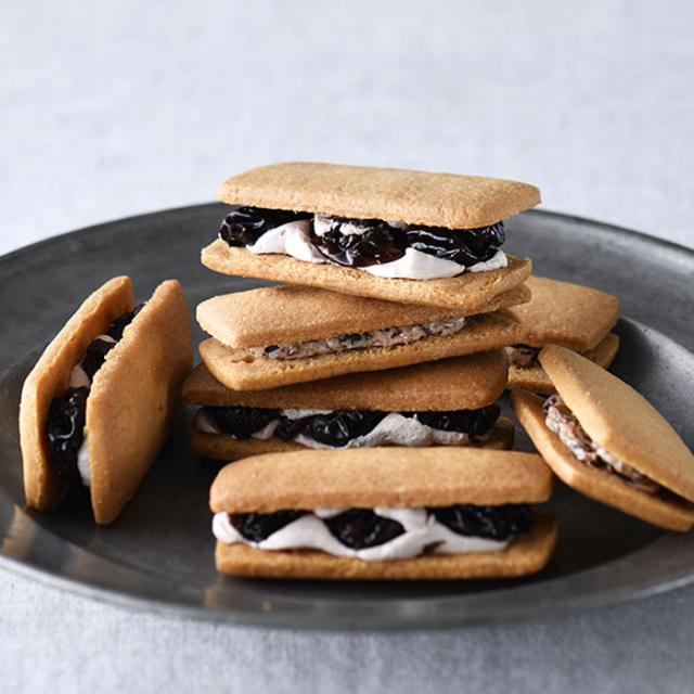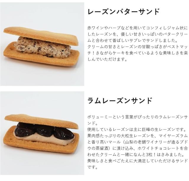 主役は山梨県産の巨峰。大粒の生レーズン3粒をマイヤーズラムとマールに漬け、ホワイトチョコクリームで挟んだ「ラムレーズンサンド」、裏ごししたレーズンに香り高いバタークリームが寄り添う「レーズンバターサンド」。ともに贅沢この上ない「ブドウ感」が秀逸。冷やすと一層おいしい。