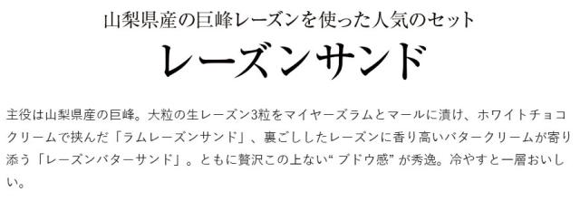 ラムレーズンサンド:干しぶどう、小麦粉、乳等を主要原料とする食品(バター、植物油脂、その他、ラム酒、砂糖、ぶどうジュース、マーガリン(植物油脂、発酵バター、加塩卵黄、脱脂粉乳)、卵、油脂加工品(植物油脂、砂糖、脱脂粉乳、ココアパウダー)、カシューナッツ、ブランデー、コーンスターチ/甘味料(トレハロース)、香料、乳化剤、酸化防止剤(V.C、V.E、ひまわり抽出物)
