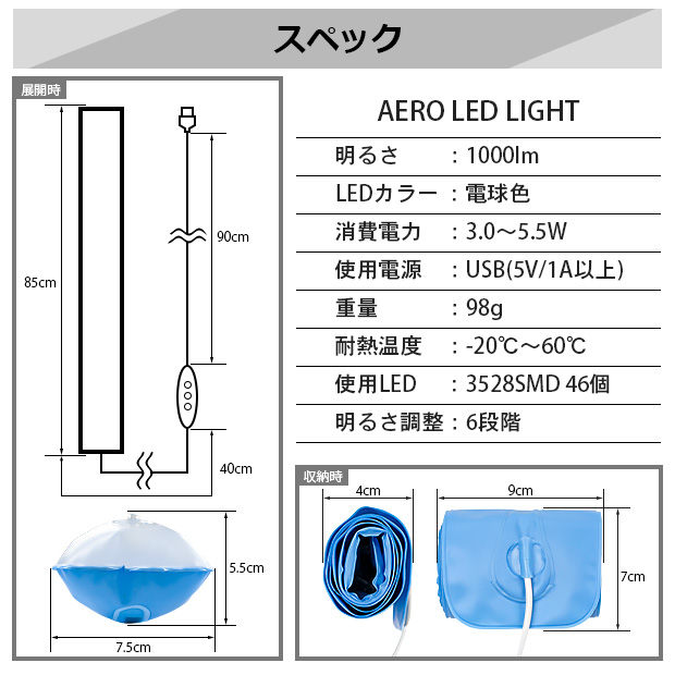 AERO LED LIGHT 85cm チューブライト キャンプライトled 吊るし USB 明るい キャンプledライト最強 おしゃれ 軽量 キャンプ用品アウトドアグッズ ブルー 50-D-55