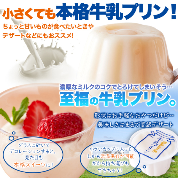 小さくても本格牛乳プリン!濃厚なのに優しい甘さとなめらかな食感が自慢。ちょっと甘いものが食べたいときやデザートなどにもおすすめ!濃厚なミルクのコクでとろけてしまいそう至福の牛乳プリンです。形状はお手軽なおやつだけど美味しさはまるで高級デザート!グラスに砕いてデコレーションすると、見た目も本格スイーツに!小さいカップに入ってしかも常温保存が可能だから持ち運びもできちゃう!優しい牛乳のコクがお口にふわっと広がる食べやすい一口サイズ。