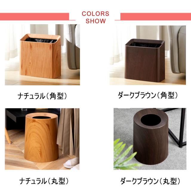 | 角型と丸型2タイプ!ごみ袋が見えないシンプルなダストボックス。 古くから家具などに使われている木材を再現した、落ち着いた色合いの上品な木目調です。 インナーボックス付きで使い勝手も◎。 しっとりと落ち着いた雰囲気はリビングにすんなり馴染みます。 和室はもちろんリビングやダイニング、寝室など場所を選ばずスッキリ置けます。 本体の形は、2種類、やわらかな印象の丸型、スリムな角型からお選びいただけます。 | |