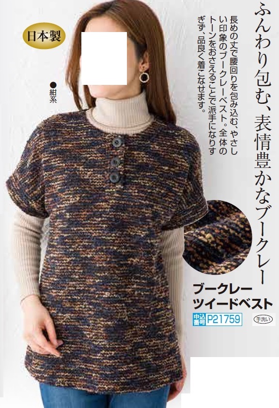 日本製 ブークレーツイードベスト 紺系 プルオーバーベスト レディース 婦人服 ミセス シニア 女性 半袖 まだら模様 ダップル ネイビー系 カラフル シニアファッション 50代 60代 70代 80代 母の日 お母さん