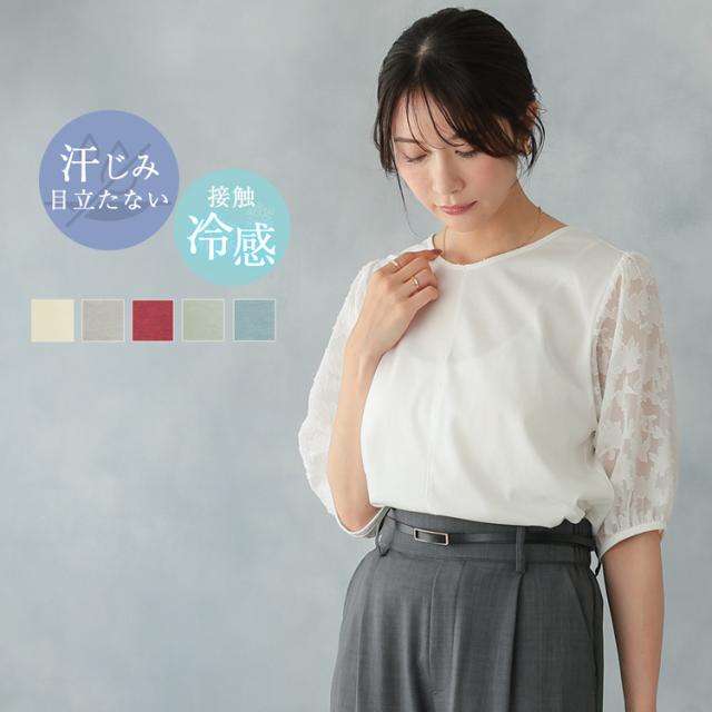 汗じみ防止 半袖 tシャツ カットソー 接触冷感 トップス レディース 綿 綿混 袖レース 夏 サマー きれいめ 大人 オフィス カジュアル 涼しい ボリューム袖 ボリュームスリーブ パフスリーブ 五分袖 クルーネック スーツインナー 白 黒 コーラルピンク サックス 5分袖 無地