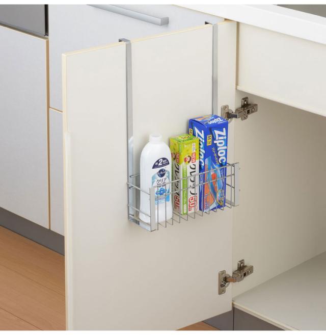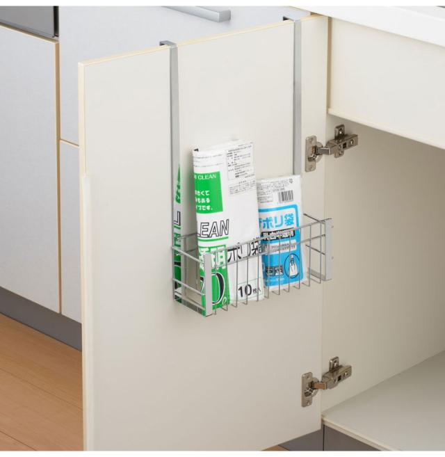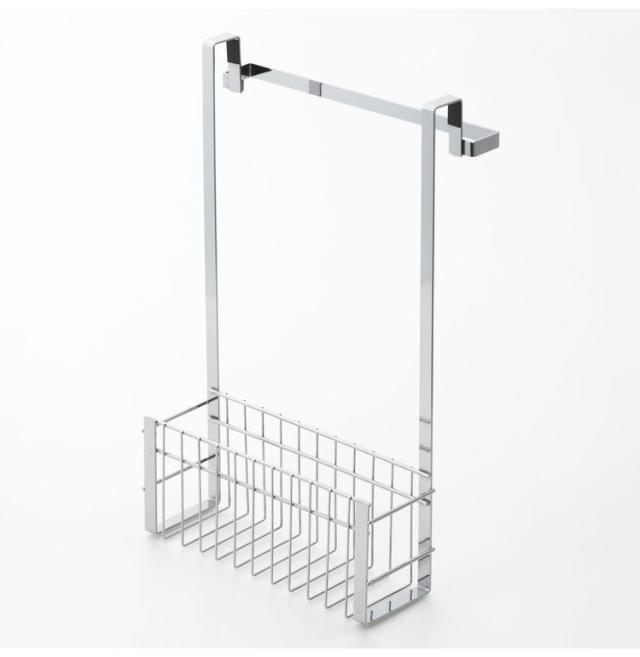 表はタオルバー、裏はバスケットになっていてゴミ袋や洗剤のストックなど収納できます。