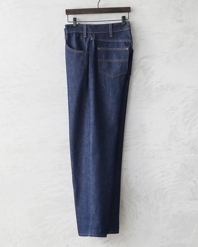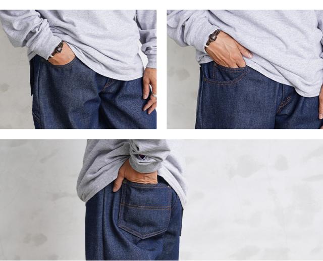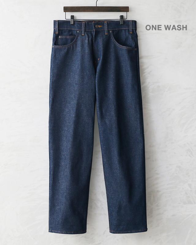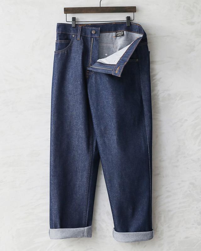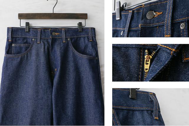 シンプルなデザインながらも14.75オンスのヘビーデニムを使ったタフなアイテムです。各ポケットはリベットで補強されており、かなり頑丈な作りになっています。ジッパーフライ仕様でロック機構が備わった金属製YKKファスナーやウォッチポケット(コインポケット)等のベーシックなデザインに加えて、ワークパンツの特徴であるパネル式のツールポケットを右側に配置。アクセントにもなっているイエローのブランドネームタグやペーパーパッチ、フラッシャーのデザインにも注目です。ブランドロゴ入りのボタンやリベットなど、細部までこだわりを感じるディテールです。