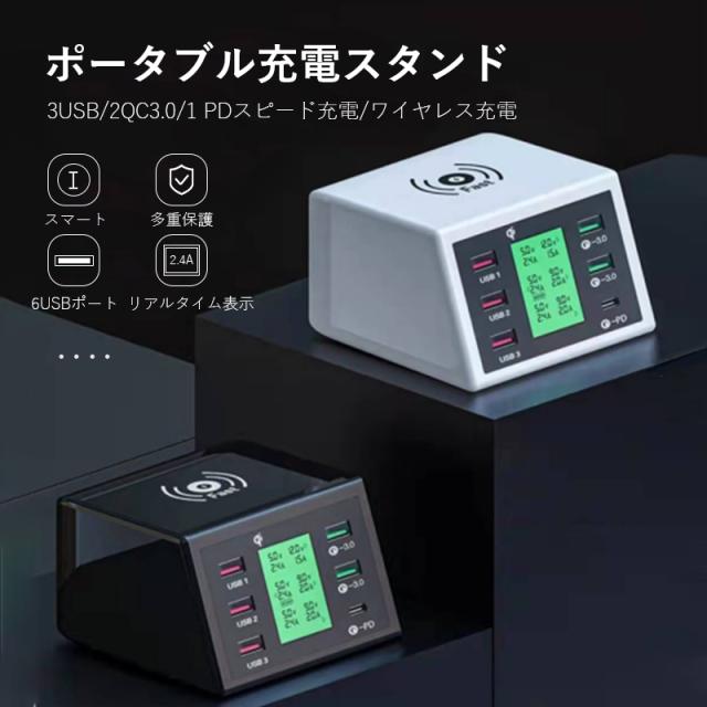 ポータブル電源 ポータブル充電器スタンド 大容量 急速 2.4A急速充電 6ポートUSB ワイヤレス充電 7台同時 自動保護 多重保護 iPhone/Android等対応 携帯充電器