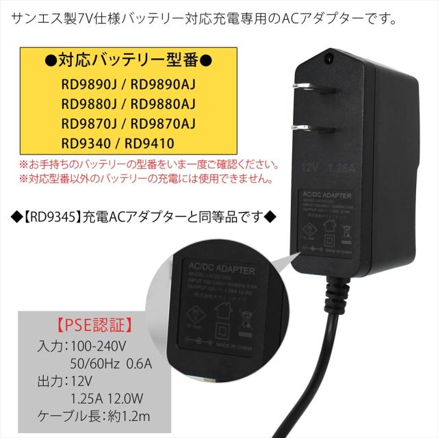 ファン付き作業服 サンエス製バッテリー対応 AC充電アダプター RD9345 同等品 12V 1.25A PSE 1.2m 急速充電 高速充電 充電器 ACアダプター 急速充電器 リチウムイオンバッテリー 充電専用 ファン付き作業服 作業服 作業