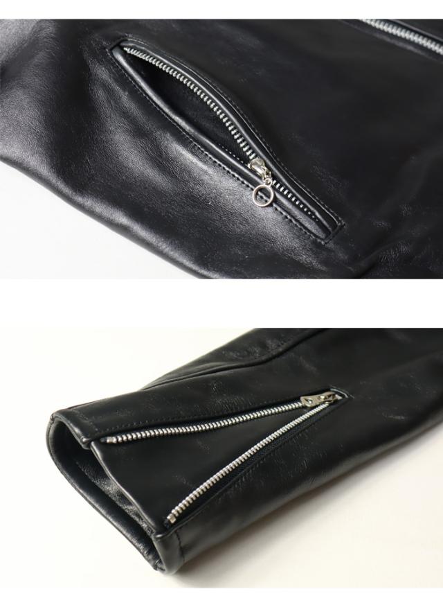 ベジタブルタンニンで鞣したやや厚手のシープスキンはシングルライダースらしく良い意味でごつさを残した仕上がり。 トップのみ薄くコーティングを施し、経年変化で味が出易くするために縫製糸もフィラメント糸を使用することで数年後が楽しみなアイテム。 ミニマルなデザインはタウンユースにも落とし込みやすい1品です。