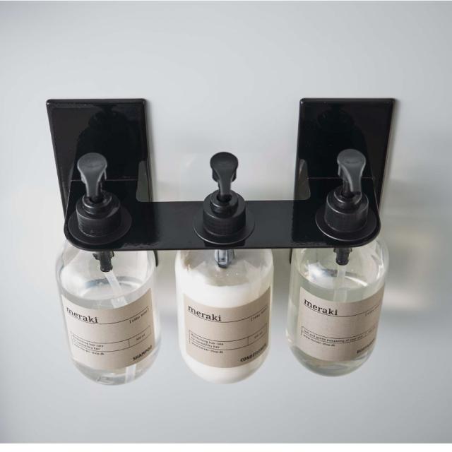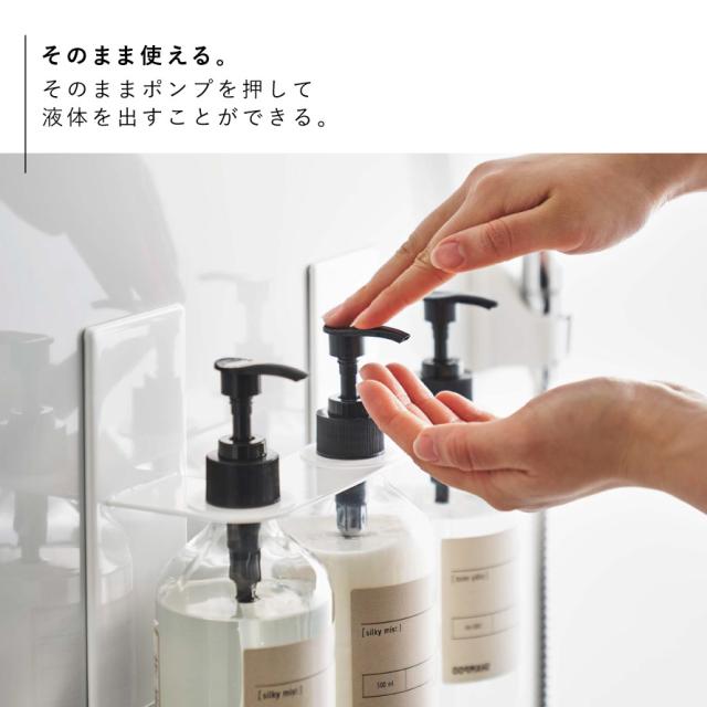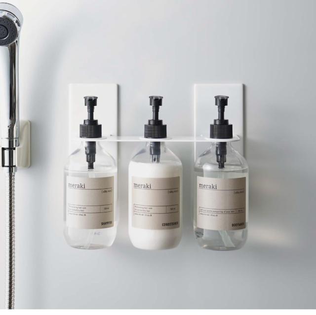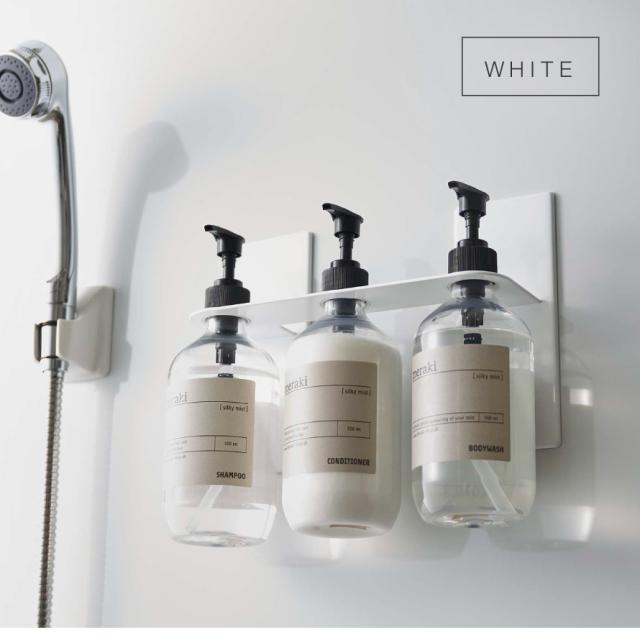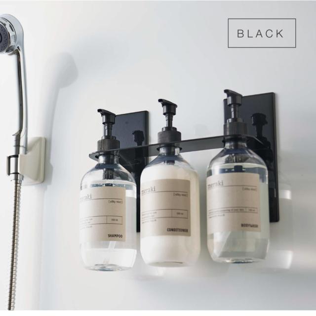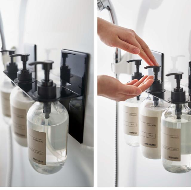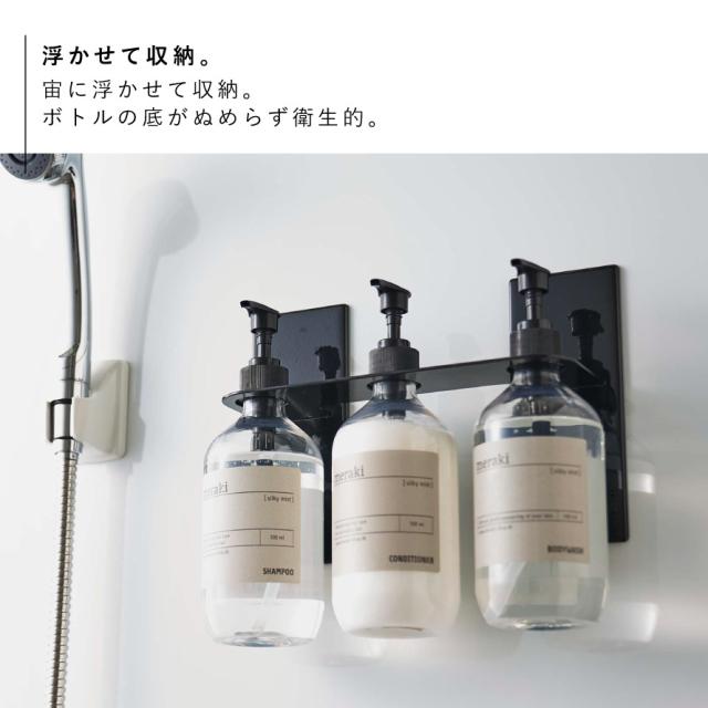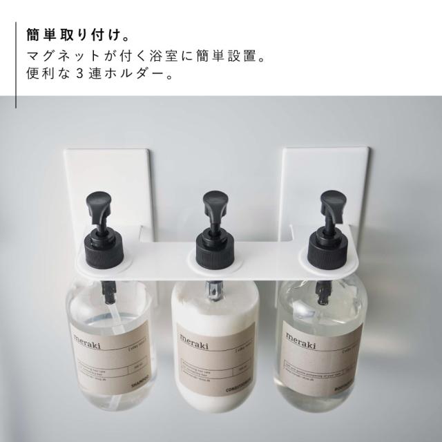 マグネットで簡単設置!浮かせて収納するのでボトル底がぬめらない。ディスペンサーをマグネットが付く場所に簡単設置できる3連ホルダー。