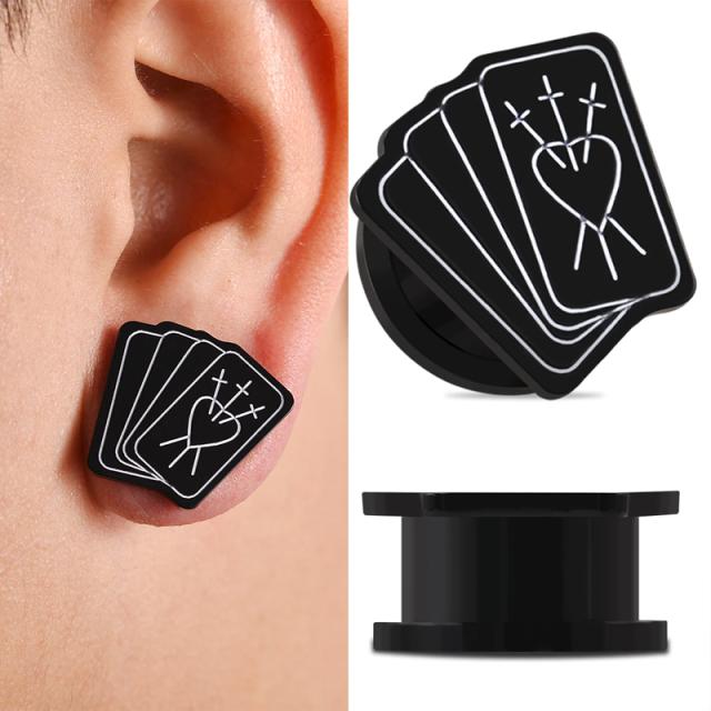 4枚のトランプのようなタロットカードをモチーフにしたかっこいいブラックトンネルは、プラスチック製なので金属アレルギーでも安心の金属アレルギー対応のボディーピアスです。ネジタイプのトンネルボディピアスは拡張器やインサーションテーパーがなくても簡単に装着できるボディピアス。スタイリッシュな黒色のトンネル型のホールピアスは男性でも女性でもジェンダーレスに使える。高級感のあるデザインはメンズでもレディースでも使えるのでペアルックやプレゼントにもオススメ。友人や友達、カレシ、カノジョとおそろコーデも!