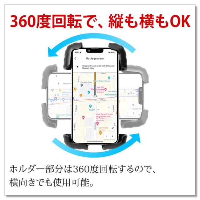 ホルダーは角度や向きが調整できるのはもちろん360度回転も出来るので、スマホを横画面で使用してもOK。