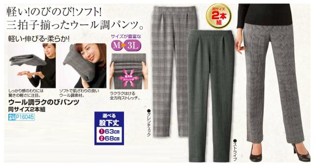 ストレッチパンツ レディース シニア 秋冬 ウール調ラクのびパンツ(2本組) 選べる股下丈 ボトムス 婦人服 ミセス グレー系 ストライプ グレンチェック シニアファッション 40代 50代 60代 70代 80代 母の日 お母さん 秋物 冬物 fri p16045 p24041 p24974