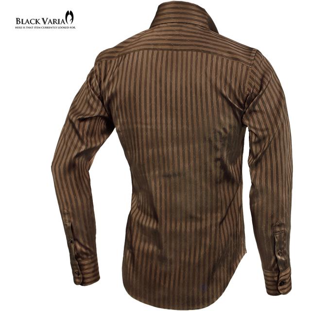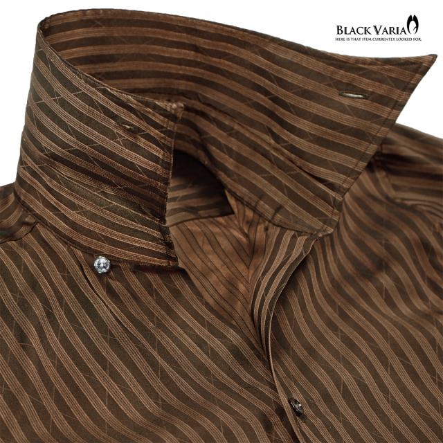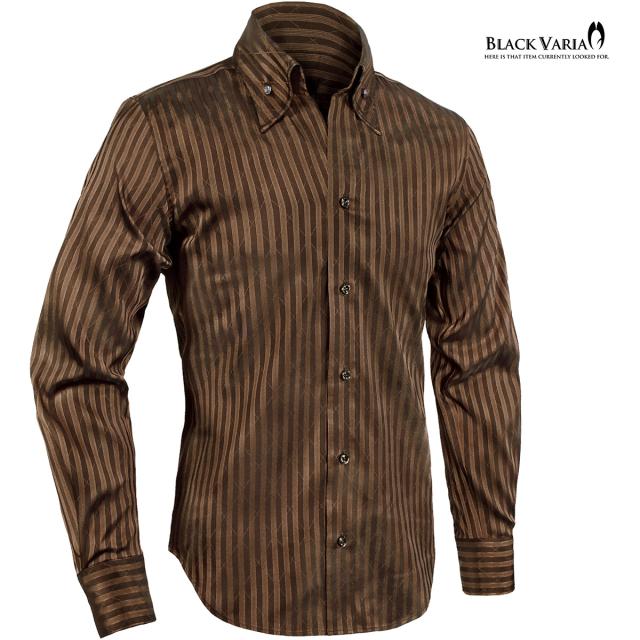 サテンシャツ スワロフスキー釦 ドレスシャツ スキッパー ストライプ ジャガード ボタンダウン スリム 日本製(ブラウン茶) 191852