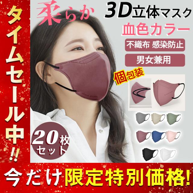 3D立体マスク 20枚 立体マスク 小顔効果 血色カラー 小さめ 蒸れない 柔らか 不織布 3D立体 血色マスク KN95 快適