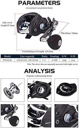 【製品仕様】自重209g、ギア比:7.3:1 ドラグ力:8kg 標準スプール巻糸量0.26mm-2.5#/210m 0.28mm-3.0#/180m 0.30mm-3.5#/140m ベアリング数:4+1BB 【超軽量&高性能】リール本体重量僅か209g、丈夫な品質で超軽量で長時間に使っても腕に負担をかけません。